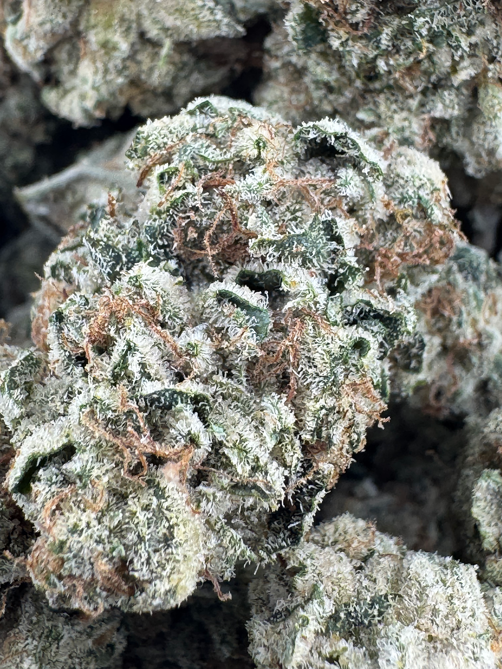 SFV OG, also known as "San Fernando Valley OG" to many members of the cannabis community, is a potent indica dominant (70% indica/30% sativa) phenotype of the OG Kush strain created by breeders at the infamous Cali Connection farms in the San Fernando Valley. This dank bud boasts an average THC level ranging from 17-22% and primarily indica effects. Users describe the SFV OG high as one with an almost immediate onset of relaxing and sedative effects that leave you feeling moderately couch locked with a light pressure in mind and body that is pain relieving. These effects are accompanied by a feeling of elevation and euphoria that is balanced by the deep indica effects. Due to these potent effects, SFV OG is an ideal strain for treating patients suffering from conditions such as mild to moderate cases of depression, chronic pain due to injury or illness, muscle spasms, and stress. SFV OG has an aroma of tangerines with a slight touch of diesel and a taste of citrusy pine with a sweet diesel aftertaste upon exhale. SFV OG buds have small dark army green nugs with olive green leaves, reddish brown hairs, and a fine layer of white trichomes and resin.